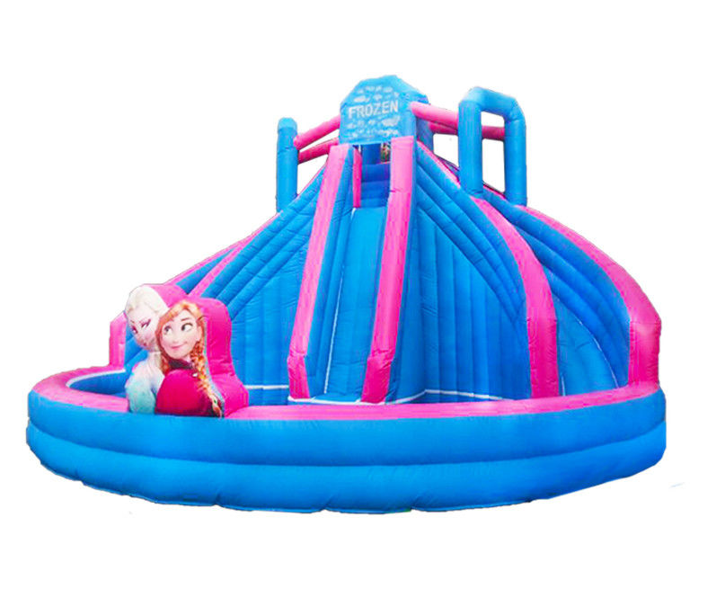 Slide inflasi bertema "Frozen" yang menawan ini memiliki kombinasi warna biru dan merah muda, menciptakan suasana yang ajaib dan es.Desain ini mencakup dua jalur geser paralel dengan desain miring lembut dan, tiga dimensi inflatable tokoh "Frozen" karakter di dasar.