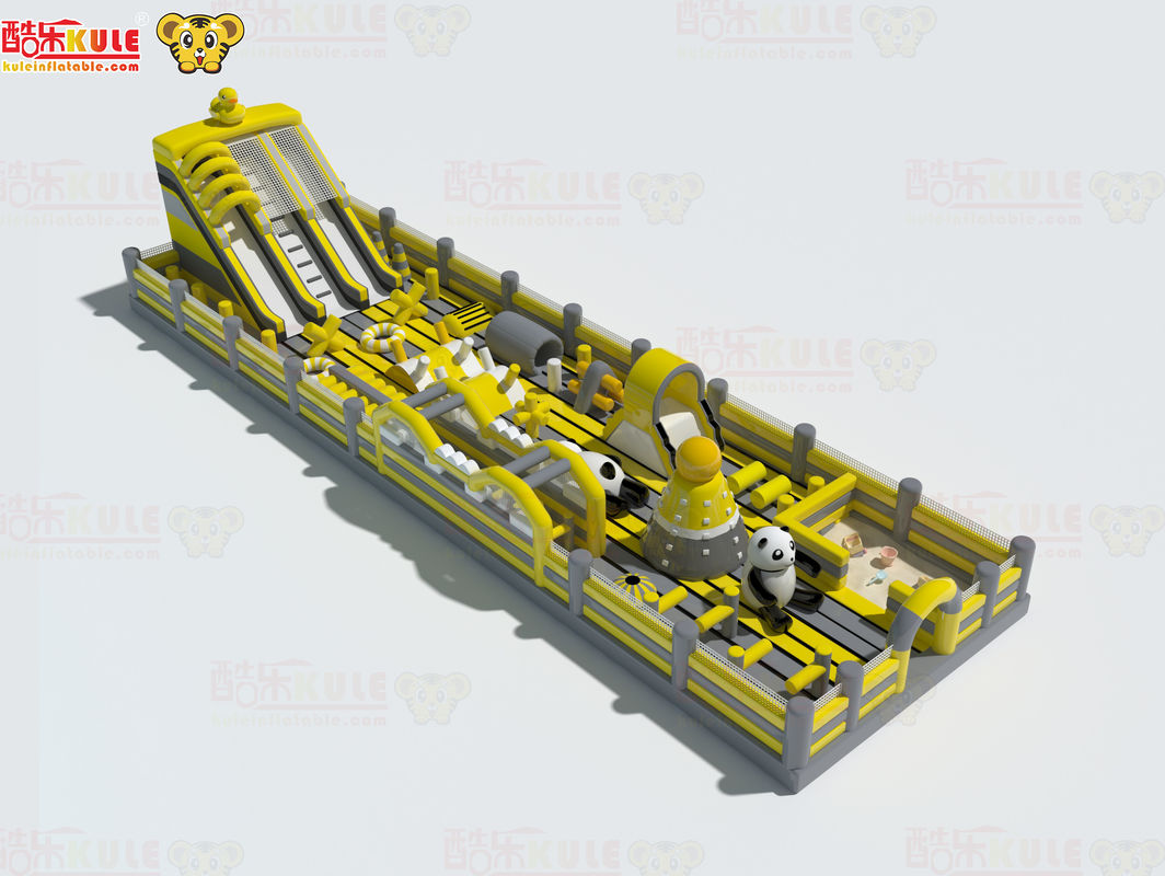 Bu büyük şişme engel parkuru, canlı bir sarı renk şemasına sahiptir ve eğlence parkları ve oyun alanları için tasarlanmıştır. Yapı, çocukları aktif oyun oynamaya teşvik etmek için çeşitli zorluklarla çoklu oyun alanları içerir.