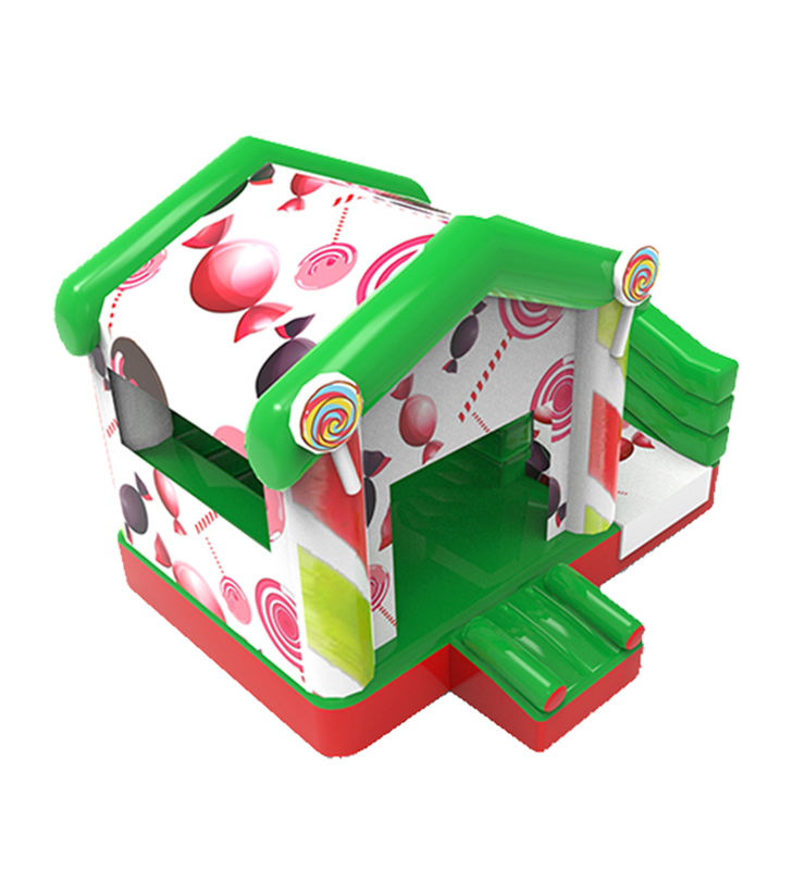 Bu şekerleme temalı şişme kale, lolipoplar ve yuvarlak şekerler de dahil olmak üzere renkli şeker desenleri ile canlı yeşil, kırmızı ve beyaz renklere sahiptir.Tasarım yeşil bir giriş ve bitişik bir kaydırma içerirÇocuklar için keyifli bir oyun ortamı yaratmak.