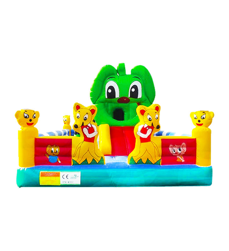 Bu parlak renkli çocukların şişme kalesi, yeşil, sarı, kırmızı ve mavi elemanlarla oyuncu bir tasarıma sahiptir.Kırmızı eşarp giyen sarı ayı figürlerinin yanları.Ortadaki kırmızı kaydırma, çocuklar için ek eğlence sağlar.